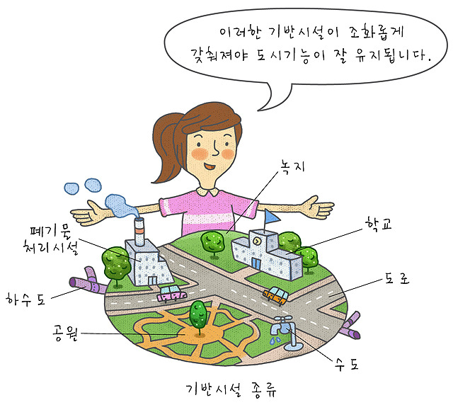 도로·공원·시장·철도 등 도시주민의 생활이나 도시기능의 유지에 필요한 물리적인 요소로 「국토의 계획 및 이용에 관한 법률」에 의해 정해진 시설
