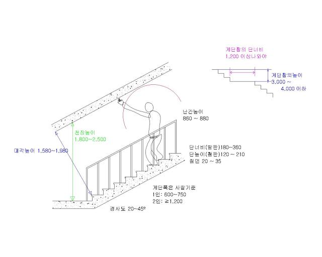 1. 높이가 3미터를 넘는 계단에는 높이 3미터 이내마다 너비 1.2미터 이상의 계단참을 설치할 것