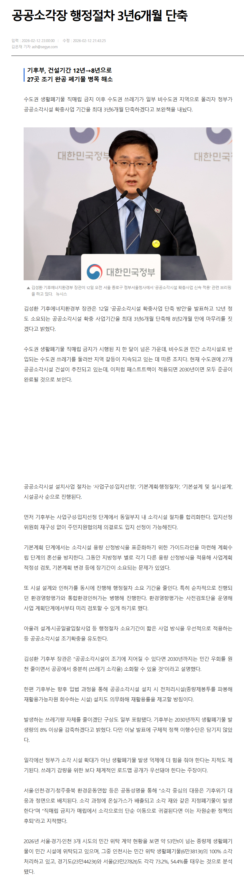 기후에너지환경부, 전처리 시설 보급으로 소각 물량 35% 이상 원천 감축