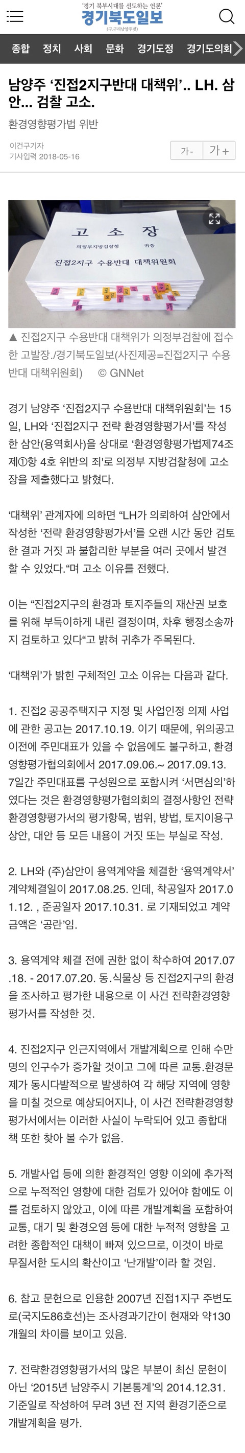 남양주 ‘진접2지구반대 대책위’.. LH. 삼안... 검찰 고소 작성자외장하드|작성시간18.05.17|조회수127 목록 댓글 0 글자크기 작게가 글자크기 크게가 남양주 ‘진접2지구반대 대책위’.. LH. 삼안... 검찰 고소 [경기북도일보] 남양주 ‘진접2지구반대 대책위’.. LH. 삼안... 검찰 고소. ▲ 진접2지구 수용반대 대책위가 의정부검찰에 접수한 고발장./경기북도일보(사진제공=진접2지구 수용반대 대책위원회) © GNNet 경기 남양주 ‘진접2지구 수용반대 대책위원회’는 15일, LH와 ‘진접2지구 전략 환경영향평가서’를 작성한 삼안(용역회사)을 상대로 ‘환경영향평가법제74조 제①항 4호 위반의 죄`로 의정부 지방검찰청에 고소장을 제출했다고 밝혔다m.gnnew.kr 다음검색 현재 게시글 추가 기능 열기 북마크 공유하기 신고 센터로 신고 댓글 댓글 0 댓글쓰기 답글쓰기 댓글 리스트