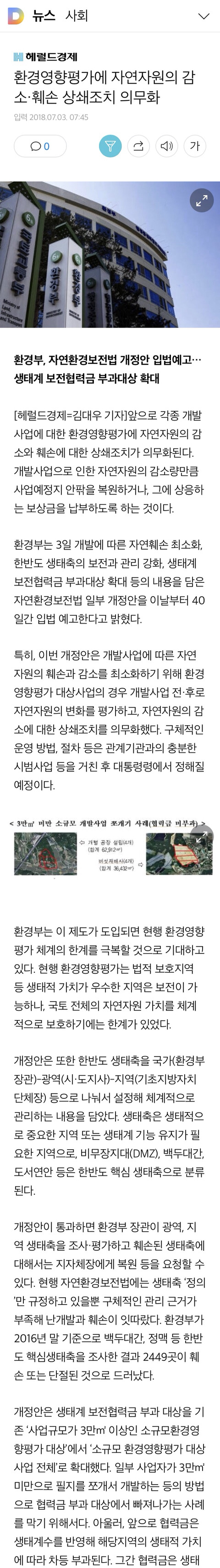 환경영향평가에 자연자원의 감소·훼손 상쇄조치 의무화 작성자외장하드|작성시간18.07.10|조회수100 목록 댓글 1 글자크기 작게가 글자크기 크게가 환경영향평가에 자연자원의 감소·훼손 상쇄조치 의무화 환경영향평가에 자연자원의 감소·훼손 상쇄조치 의무화환경부, 자연환경보전법 개정안 입법예고…생태계 보전협력금 부과대상 확대[헤럴드경제=김대우 기자]앞으로 각종 개발사업에 대한 환경영향평가에 자연자원의 감소와 훼손에 대한 상쇄조치가 의무화된다. 개발사업으로 인한 자연자원의 감소량만큼 사업예정지 안팎을 복원하거나, 그에 상응하는 보상금을 납부하도록 하는 것이다. 환경부는 3일 개발에 따른 자연훼손 최소화, 한반v.media.daum.net 다음검색 현재 게시글 추가 기능 열기 북마크 공유하기 신고 센터로 신고 댓글 댓글 1 댓글쓰기 답글쓰기 댓글 리스트 작성자문스 | 작성시간 18.07.15 환경영향평가제도가 만능이구만요.... 댓글 전체보기
