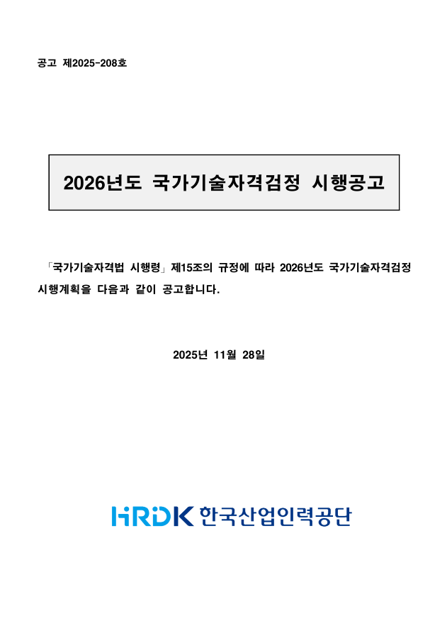 2026년도 국가기술자격검정 시행공고, 한국산업인력공단