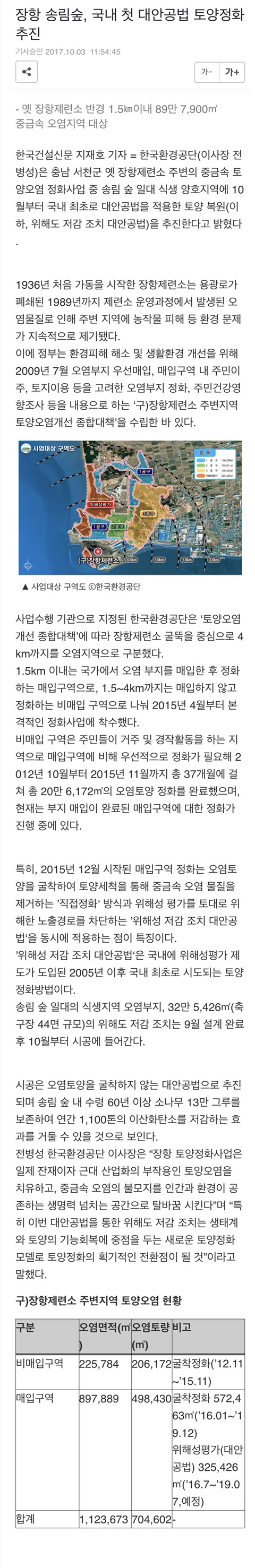 장항 송림숲, 국내 첫 대안공법 토양정화 추진 작성자외장하드|작성시간17.10.05|조회수29 목록 댓글 0 글자크기 작게가 글자크기 크게가 장항 송림숲, 국내 첫 대안공법 토양정화 추진 옛 장항제련소 반경 1.5㎞이내 89만 7,900㎡ 중금속 오염지역 대상 장항 송림숲, 국내 첫 대안공법 토양정화 추진한국건설신문 지재호 기자 = 한국환경공단(이사장 전병성)은 충남 서천군 옛 장항제련소 주변의 중금속 토양오염 정화사업 중 송림 숲 일대 식생 양호지역에 10월부터 국내 최초로 대안공법을 적용한 토양 복원(이하, 위해도 저감 조치 대안공법)을 추진한다고 밝혔다.1936년...m.conslove.co.kr 다음검색 현재 게시글 추가 기능 열기 북마크 공유하기 신고 센터로 신고 댓글 댓글 0 댓글쓰기 답글쓰기 댓글 리스트