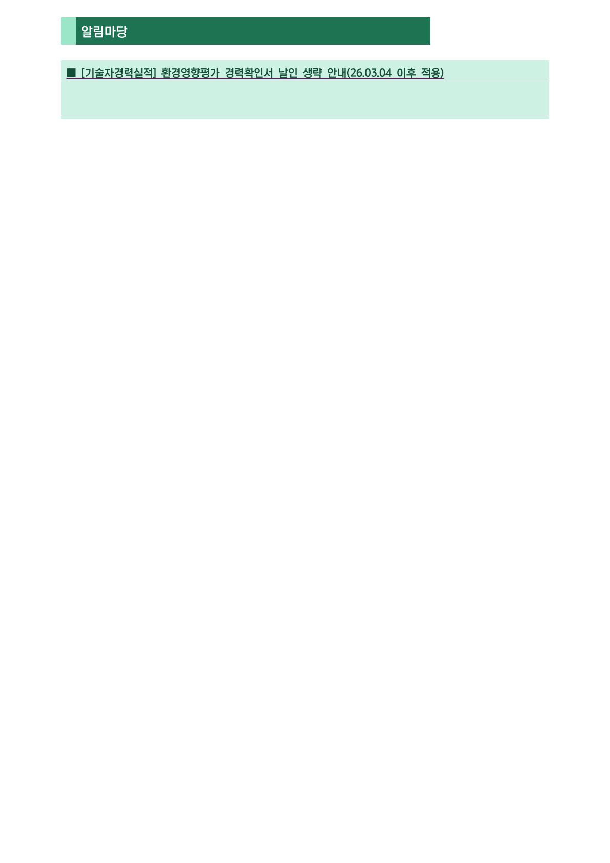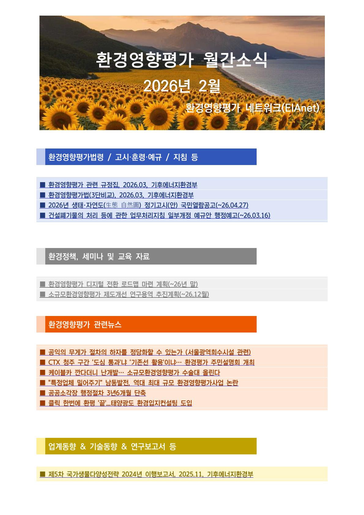 환경영향평가 네트워크 월간소식지(2026년 2월) 작성자외장하드|작성시간26.03.17|조회수28 목록 댓글 0 글자크기 작게가 글자크기 크게가 환경영향평가 네트워크 월간소식지(2026년 2월) 환경영향평가 월간소식(26년 02월).pdf94.84KB 첨부파일첨부된 파일이 3개 있습니다. jpg 파일 환경영향평가 월간소식(26년 02월)-2.jpg 다운로드 jpg 파일 환경영향평가 월간소식(26년 02월)-1.jpg 다운로드 pdf 파일 환경영향평가 월간소식(26년 02월).pdf 다운로드 다음검색 현재 게시글 추가 기능 열기 북마크 공유하기 신고 센터로 신고 댓글 댓글 0 댓글쓰기 답글쓰기 댓글 리스트