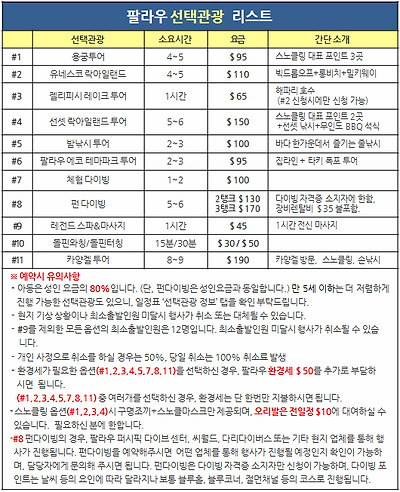 | 포함내역 | 왕복 항공권,숙박비,식사비,차량비,1억원 여행자 보험,인천공항세,관광진흥개발기금,전쟁 보험료,팔라우 현지 공항세 $35 | |||||||||||||