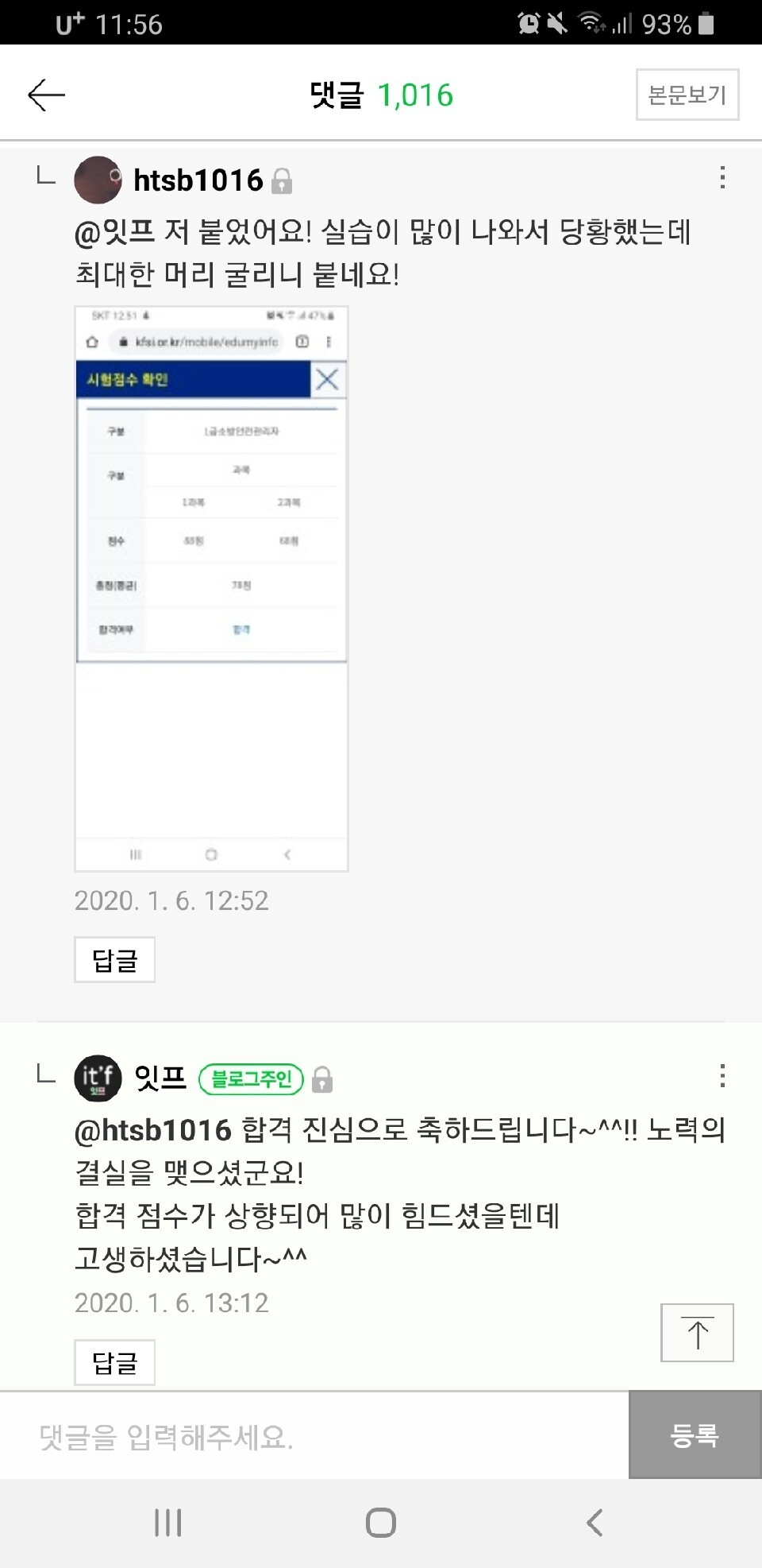 저는 소방안전관리자 1급 55회차 시험 합격하였는데요~