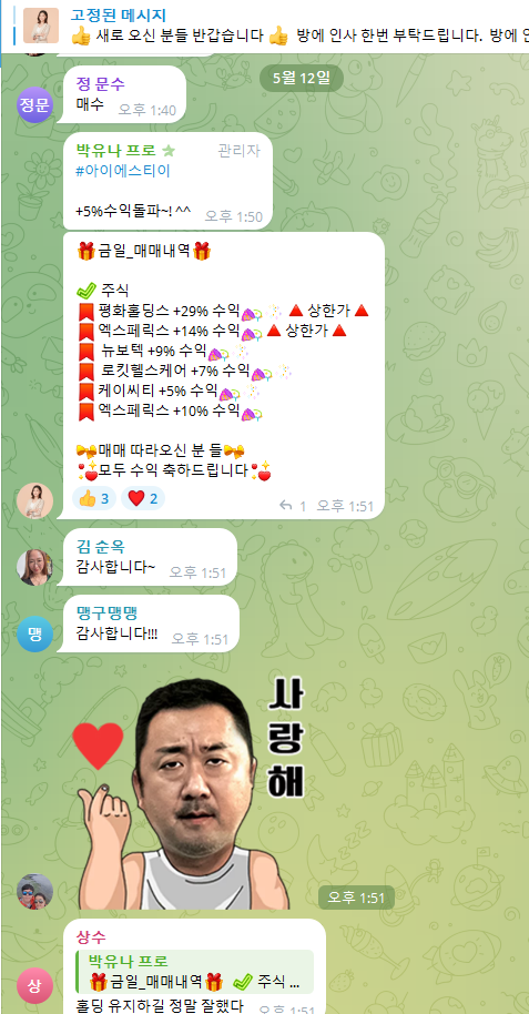 5월 12일 아침에 공유해주신 급등종목 덕분에 시원하게 수익 봤습니다!