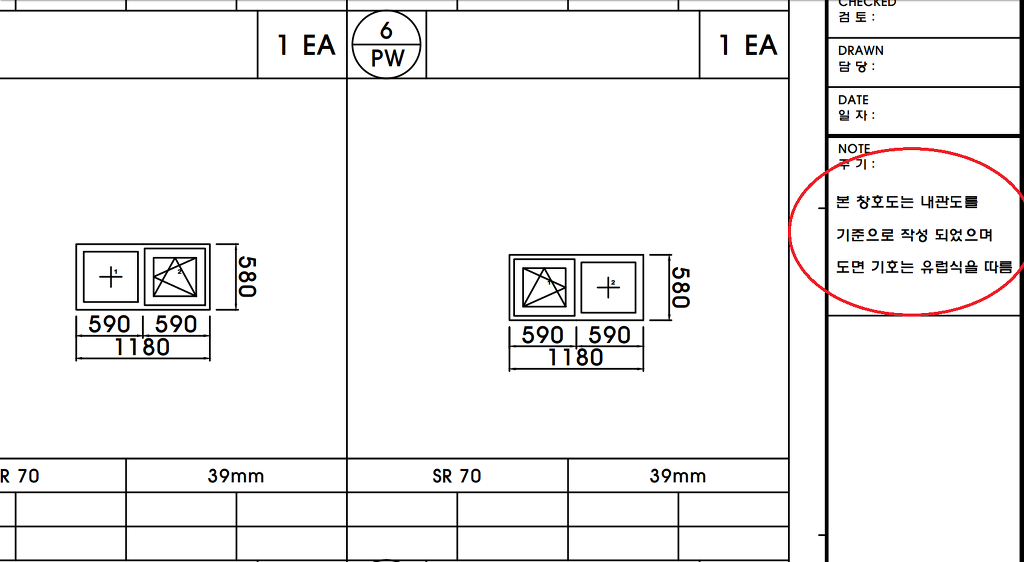 일반적으로 설계 사무소에서 독일식 시스템 창호 제작 발주시에 외관도로 들어옵니다.
