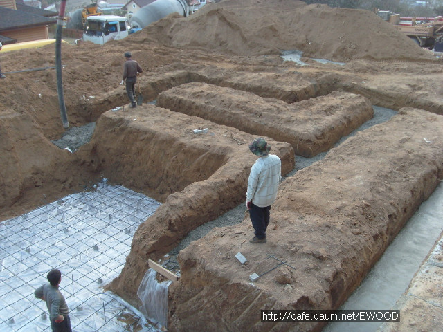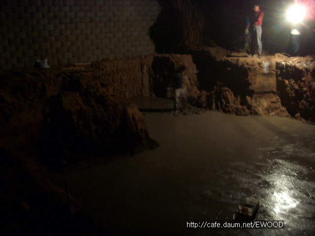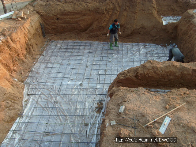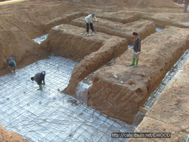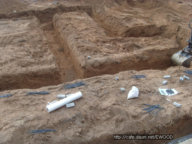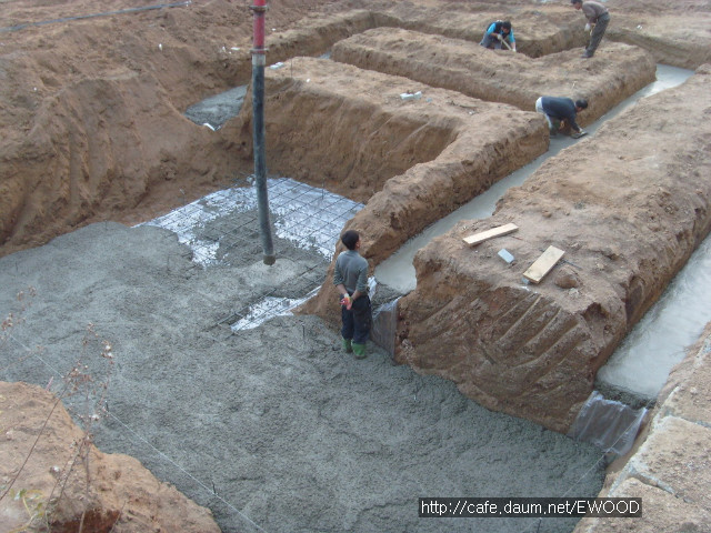 기초를 위한 터파기 공사를 했고, 기초 자리에 레미콘을 타설했습니다.