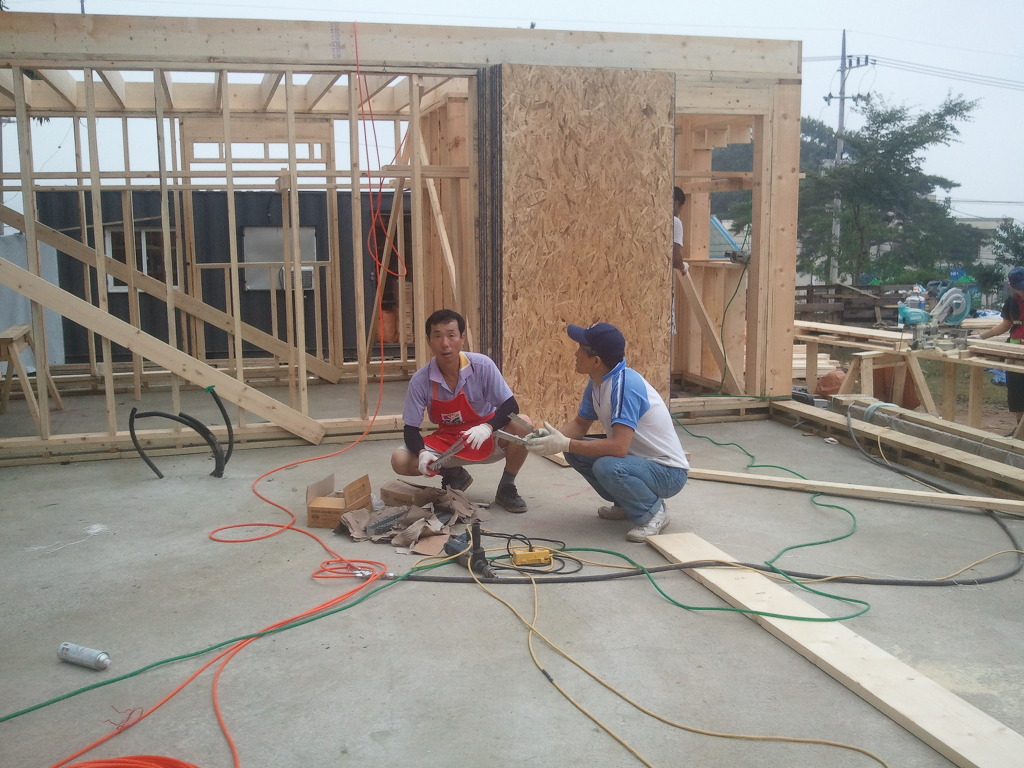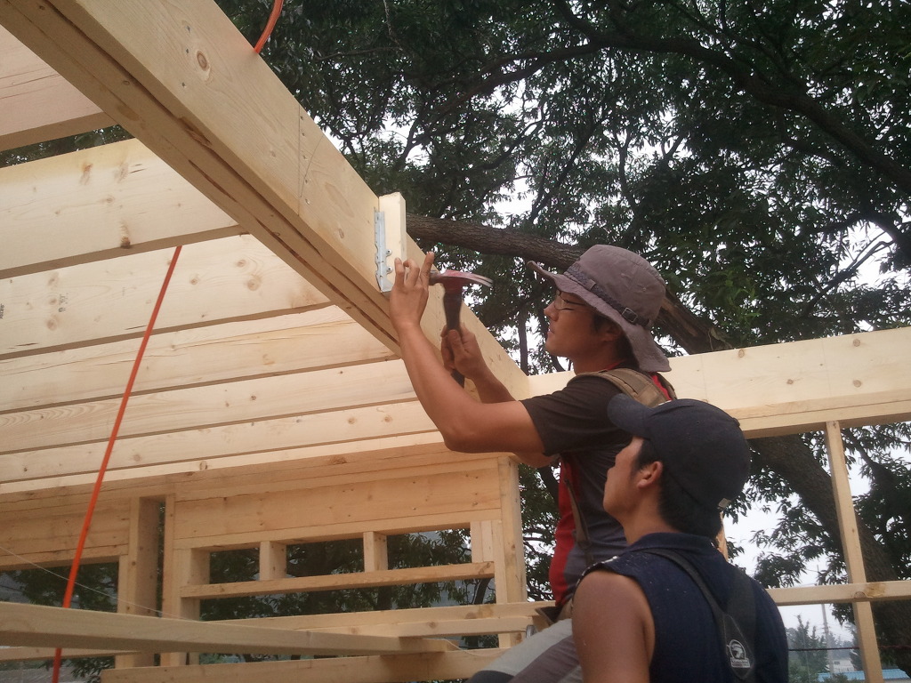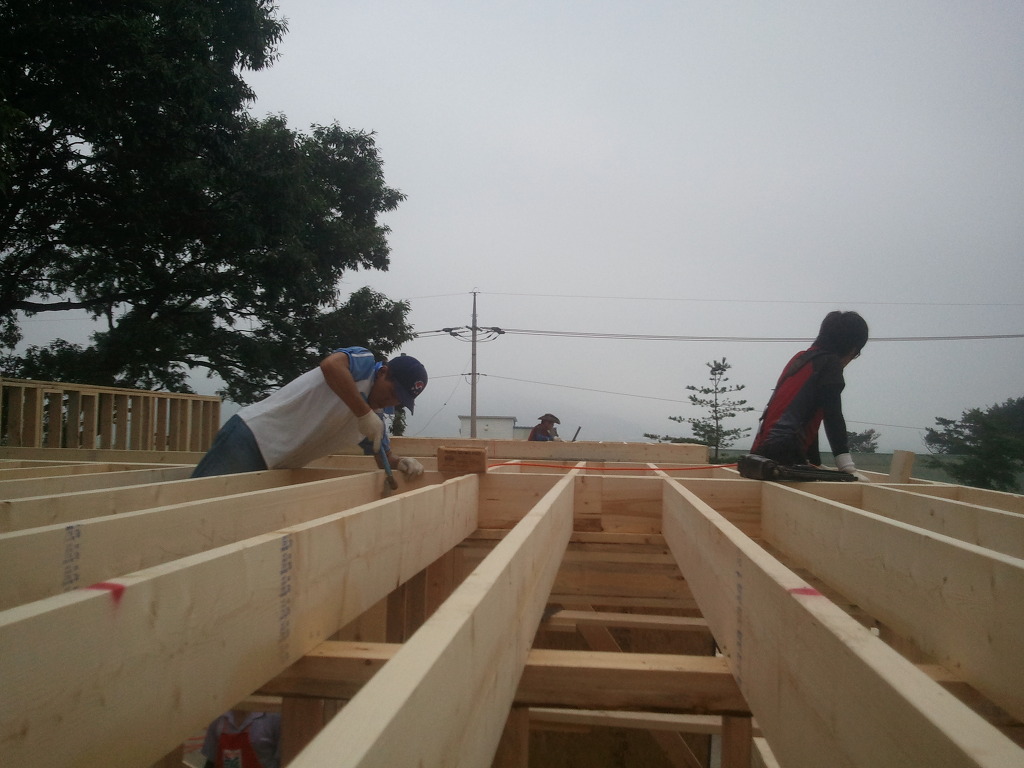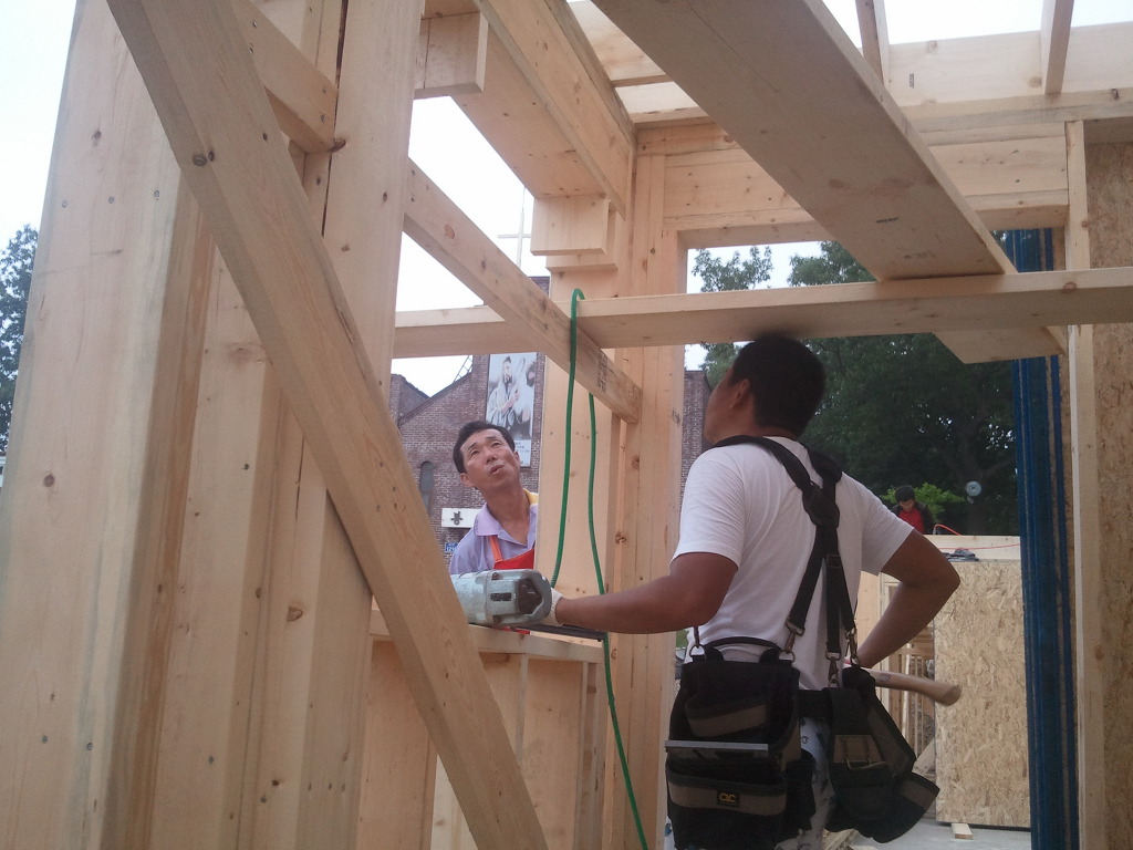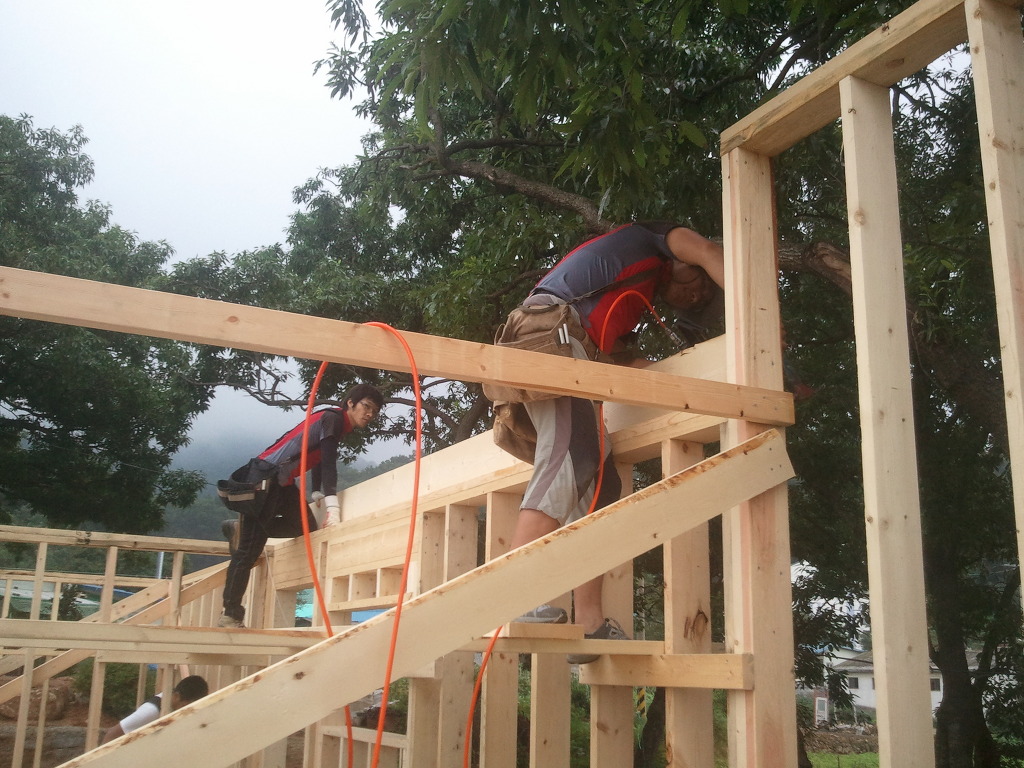 오윤수목수가 걸어 놓은 디딤판을 발판으로 하여 팀장님과 두용씨가 함께 작업을 합니다.
