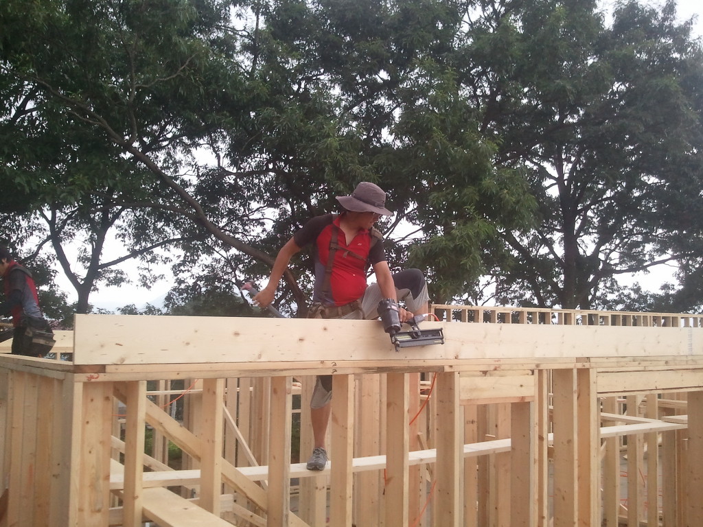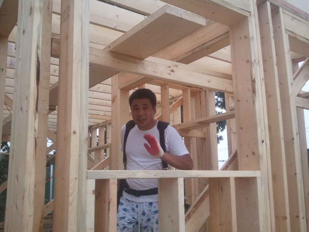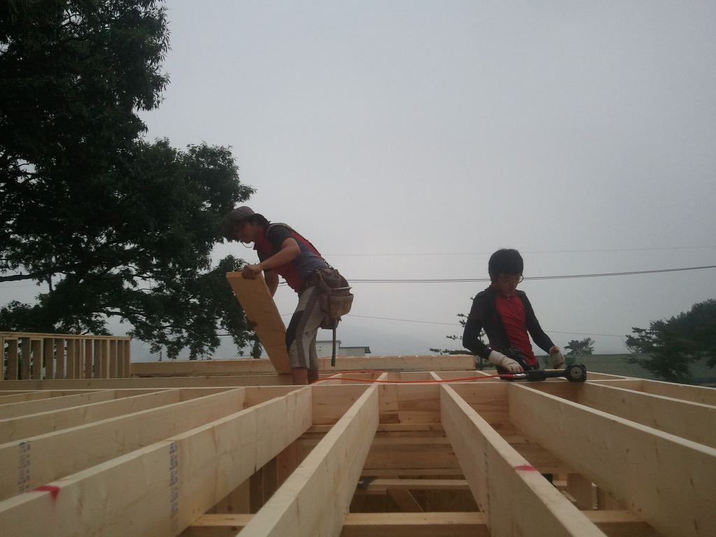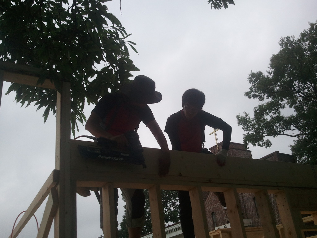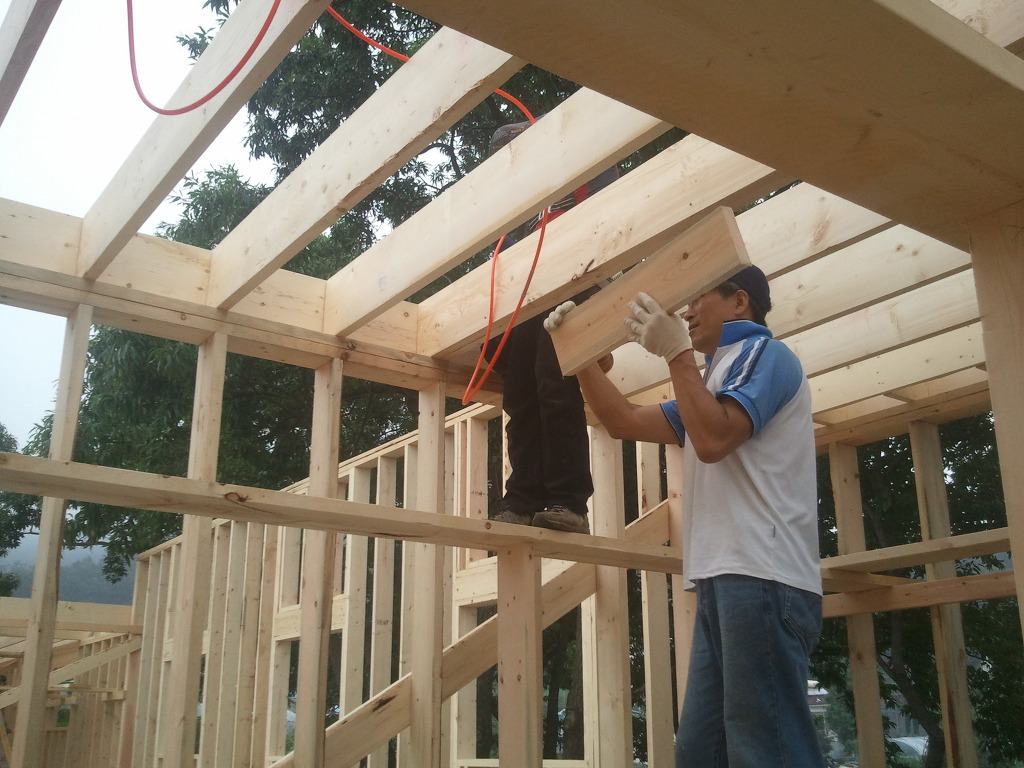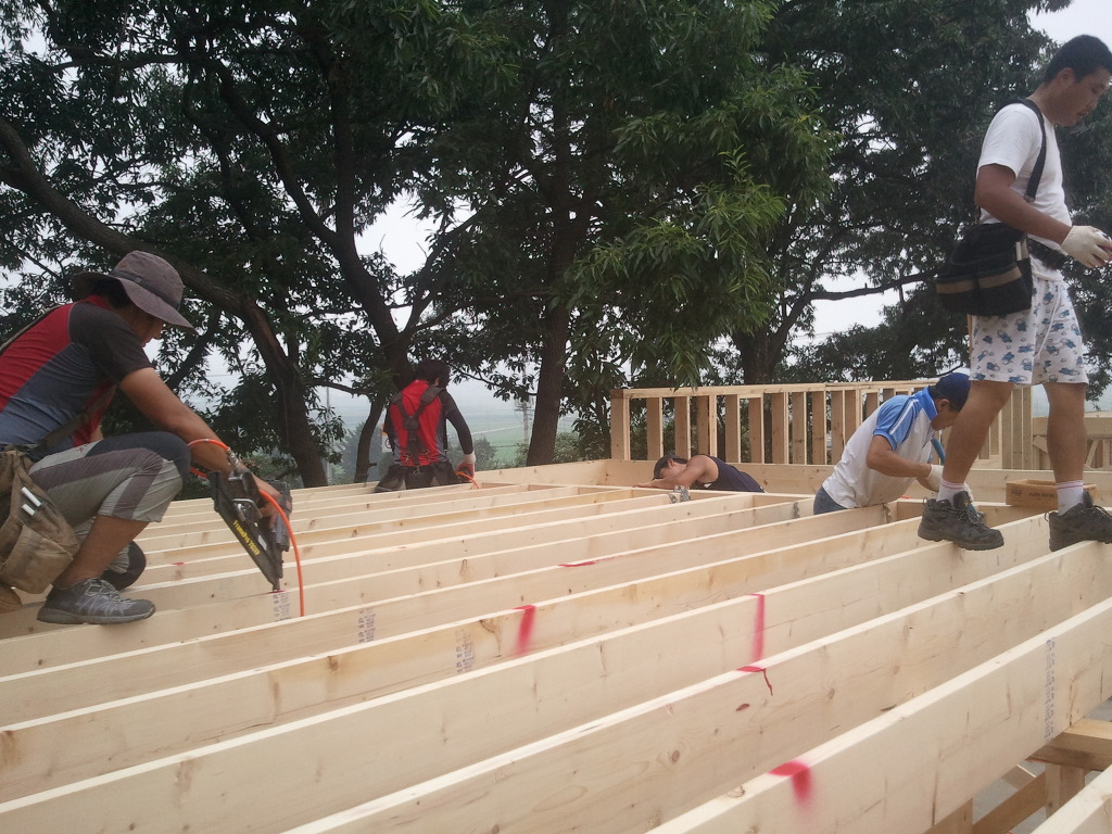 오윤수목수가 걸어 놓은 디딤판을 발판으로 하여 팀장님과 두용씨가 함께 작업을 합니다.