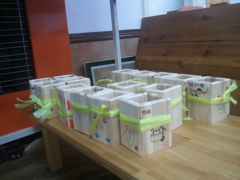 그동안 목공작업으로 연필통을 만들었습니다. 김정기 권사님의 밤샘 수고로 아이들이 마냥 기쁩니다.