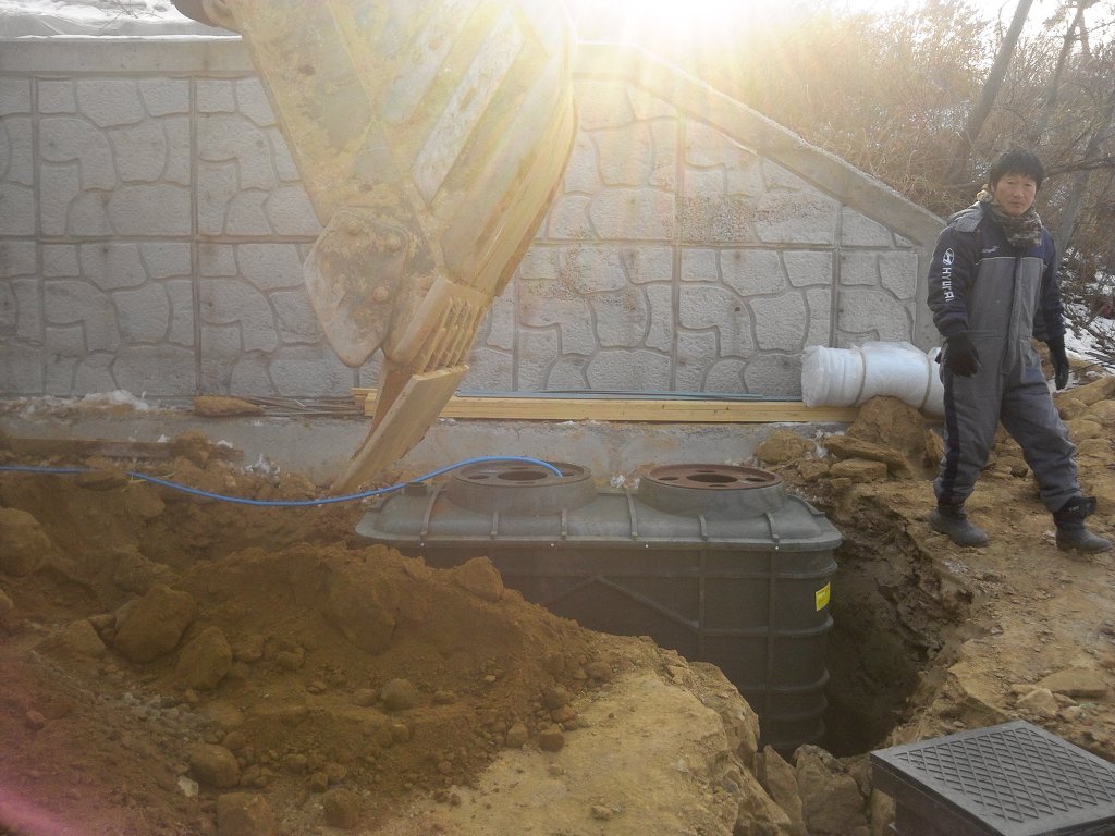 흙을 매우기전에 정화조에 물을채워 토압으로 정화조가 찌그러드는것을 예방합니다