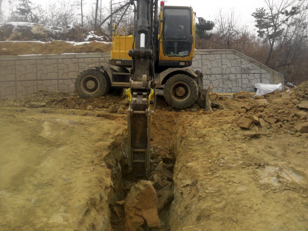 지반이 대부분 암이라 뿌레카로 깨고 있네요