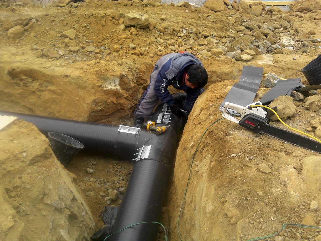 주름관 연결부위를 시트지로 감싸고 조인트커버를 덮고 피스로 조여 고정합니다