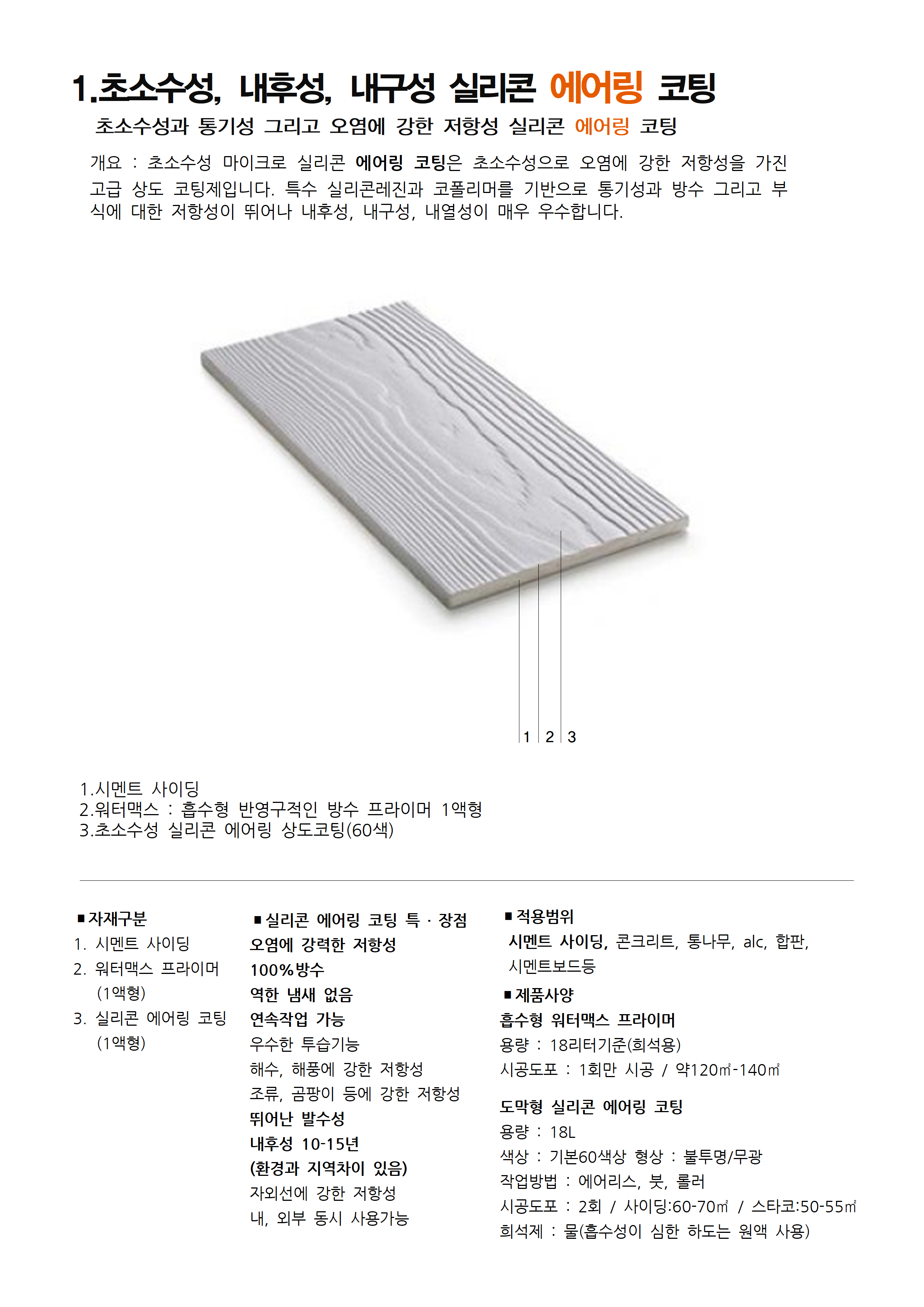 2.초소수성 실리콘 에어링 상도코팅 : 수용성 일액형 / 18리터 / 2회 / 약 60-70㎡ / 에어리스, 롤러