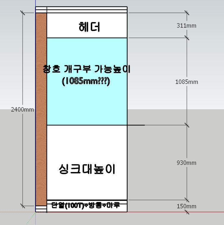 계산해보니 창호 개구부 가능높이가 약 1085mm 밖에 않되네요(*첨부사진참조)