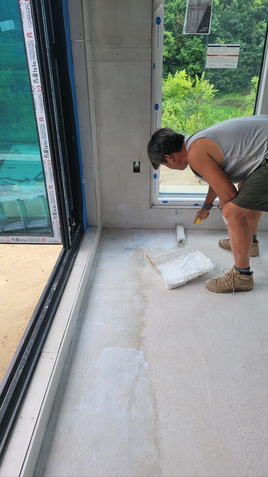 시멘트보드 시공후 방수시공을 위한 사전 작업(먼지제거,프라이머시공,피스구멍 및 보드 연결부 코킹)