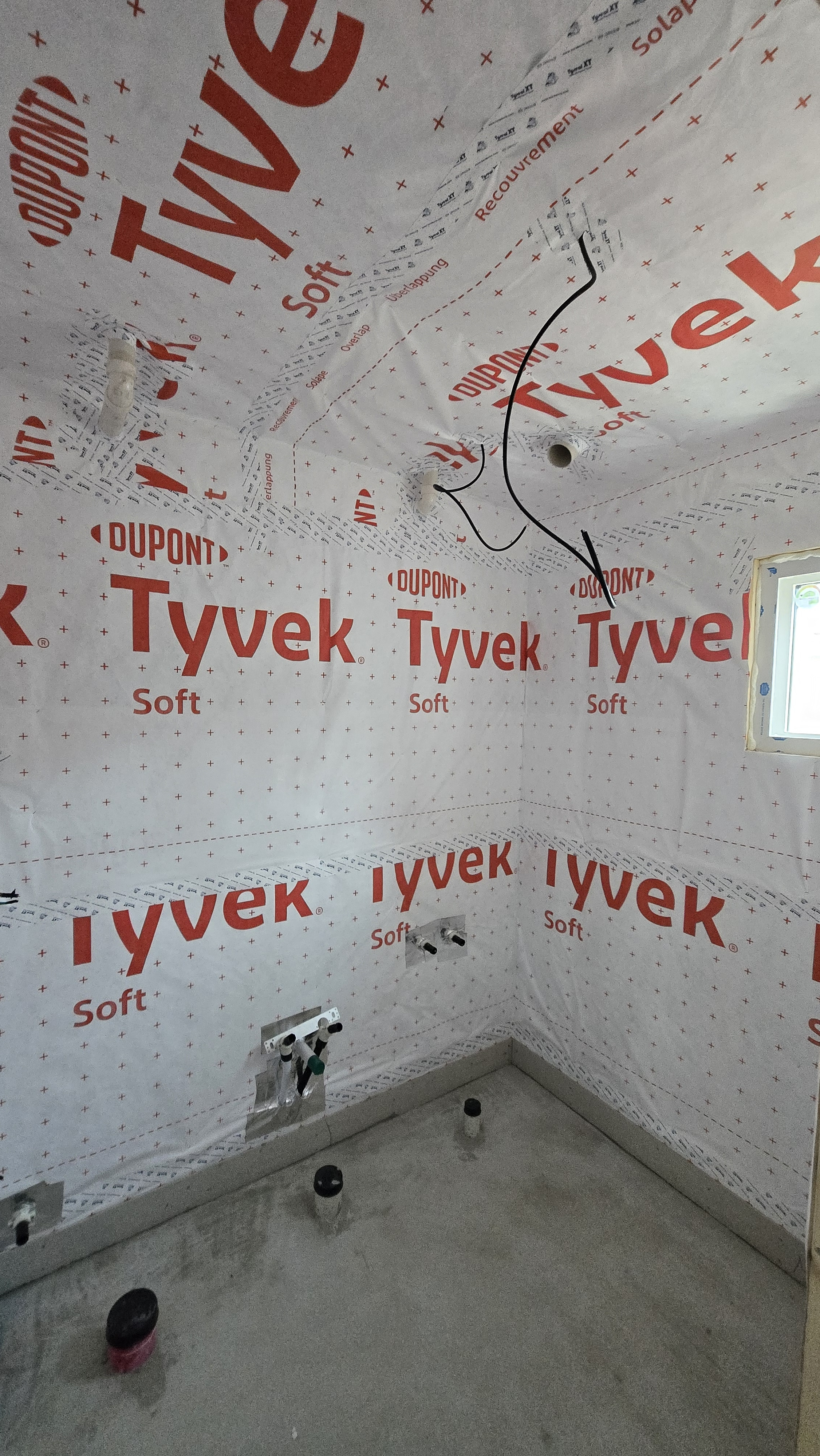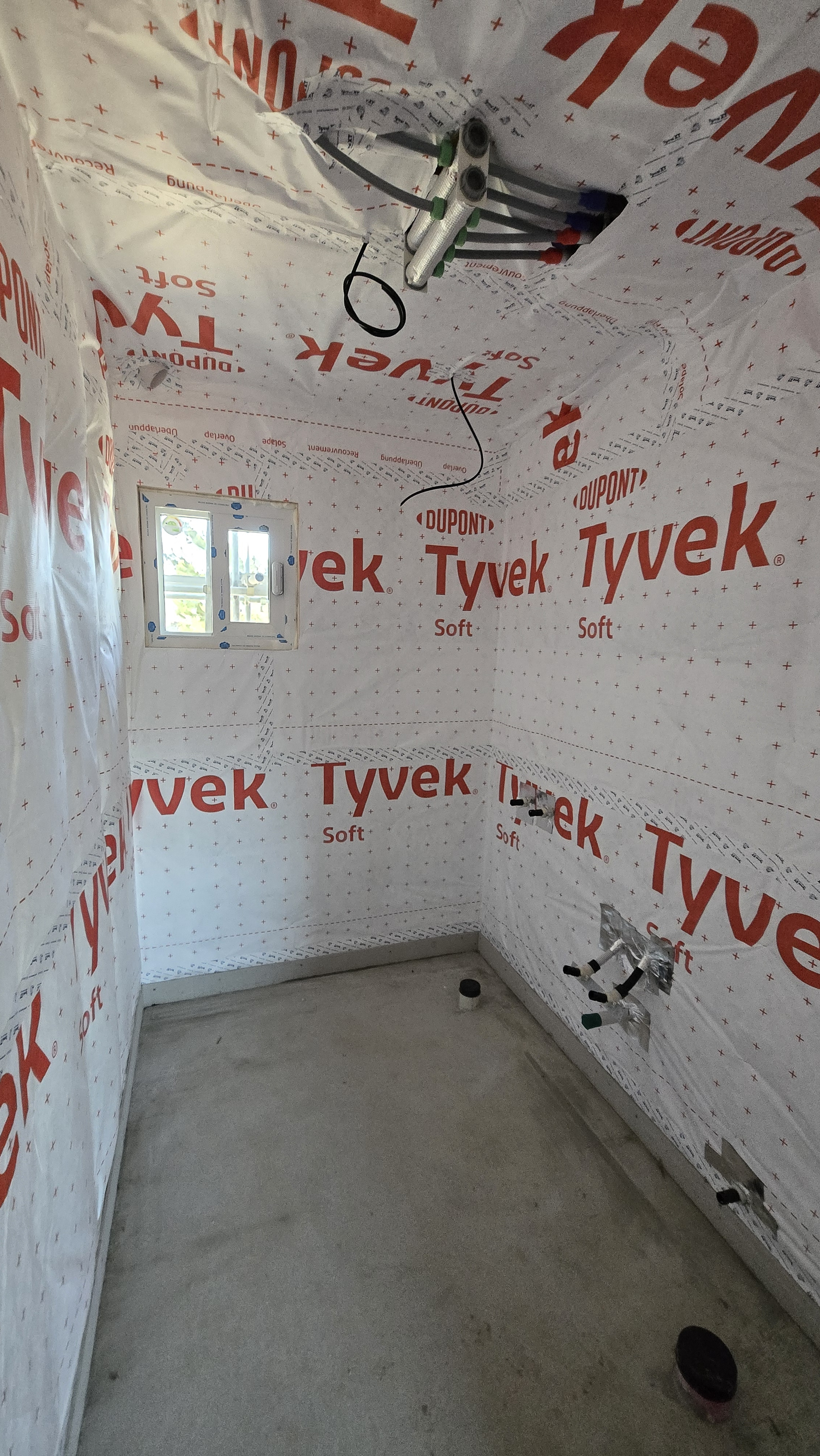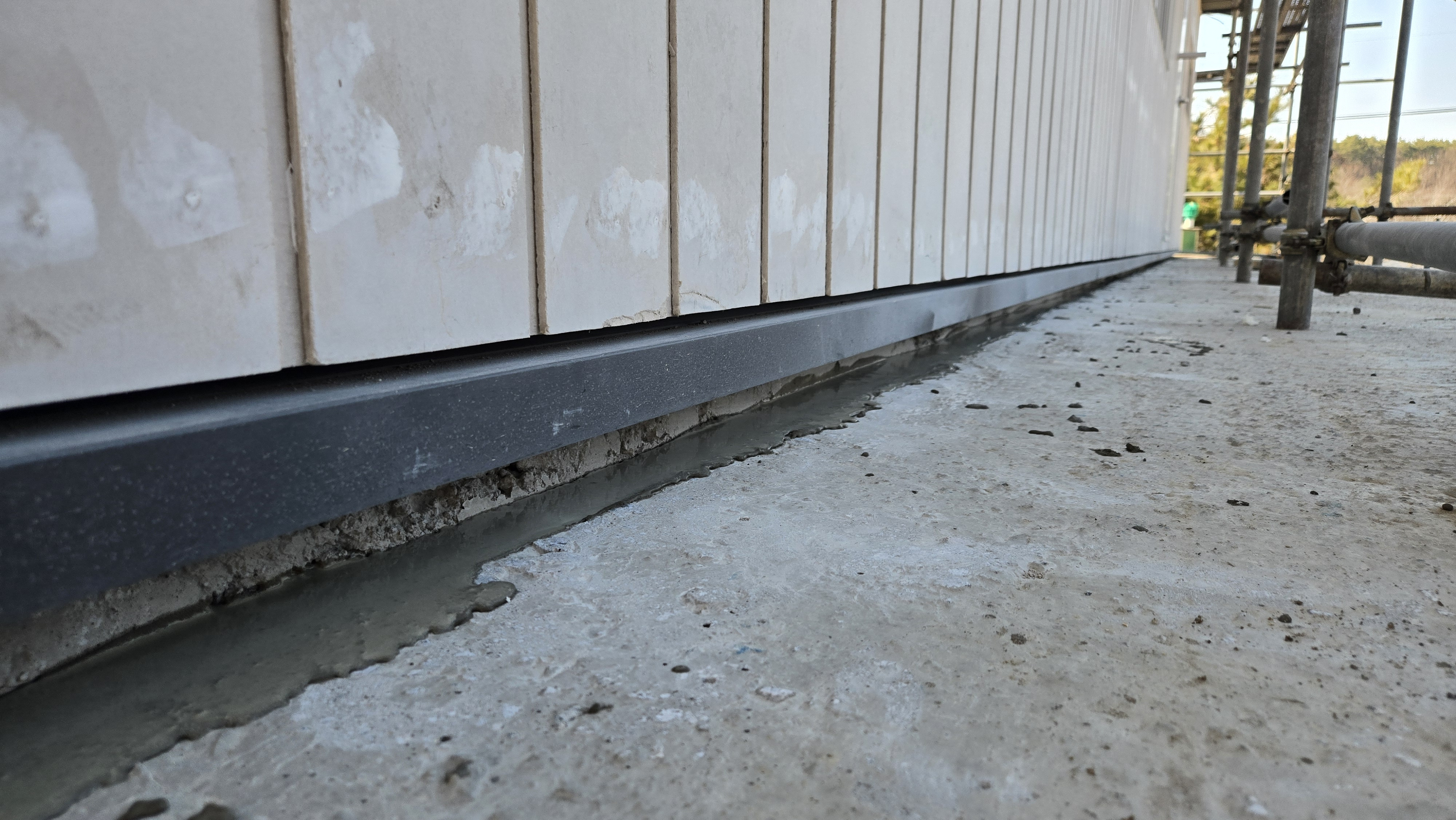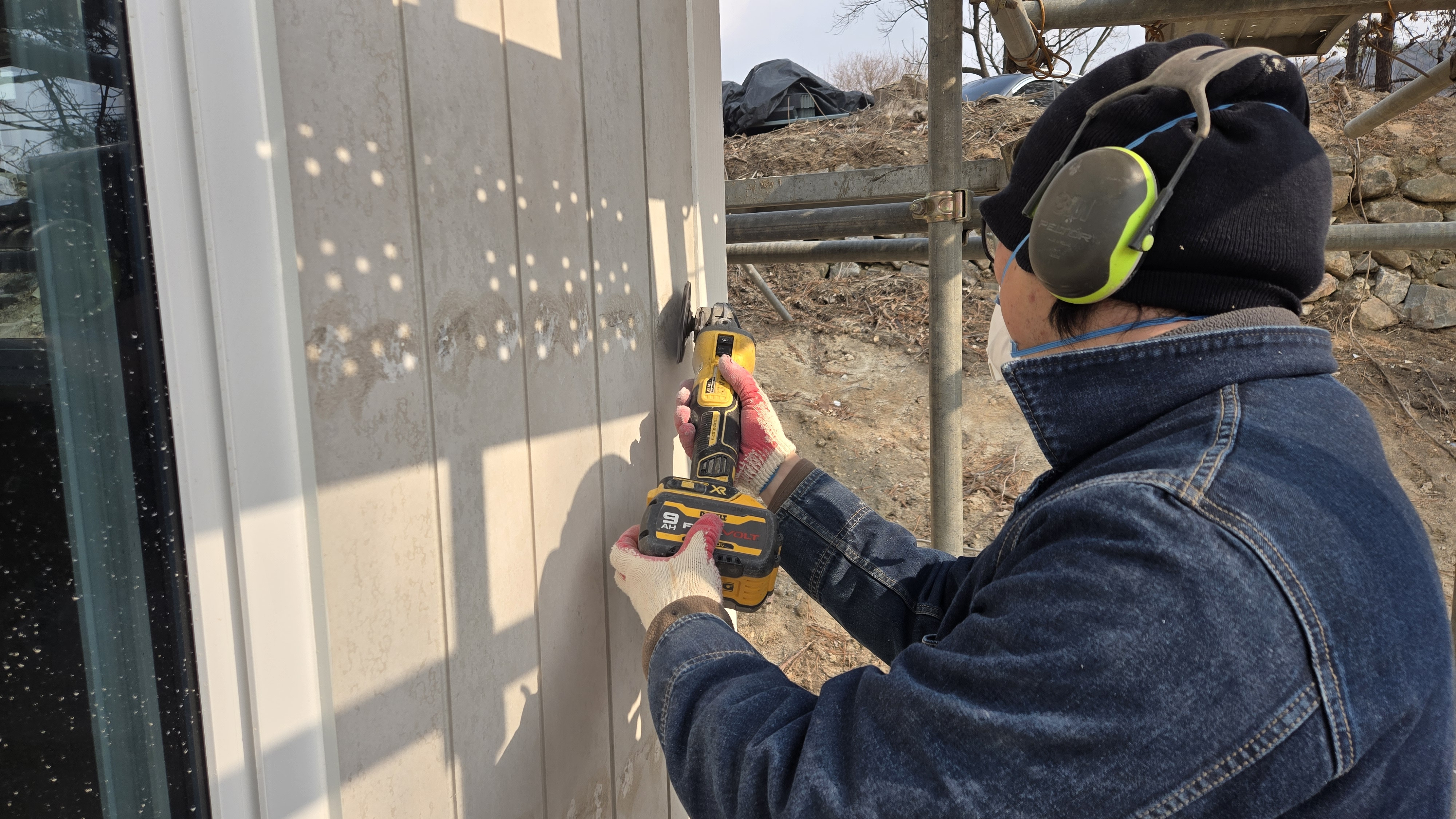 ( 하우스랩 및 기밀 테이프 시공, 시멘트 보드 및 젠다이 시공, 프라이머 도장 및 실리콘 코킹중)