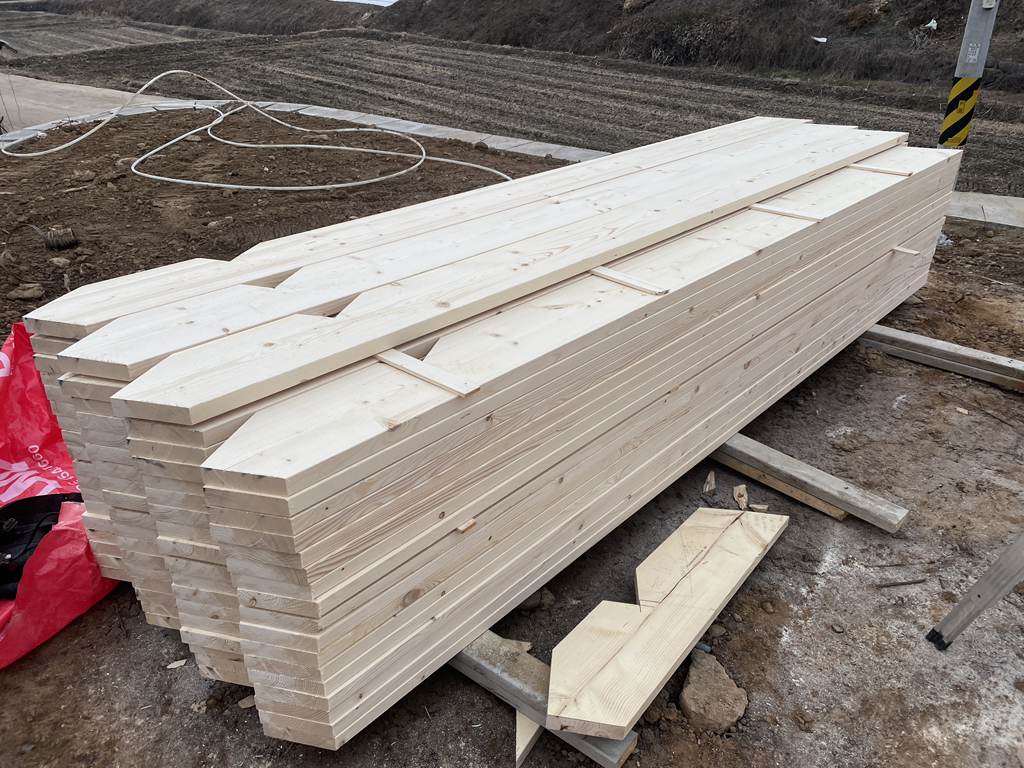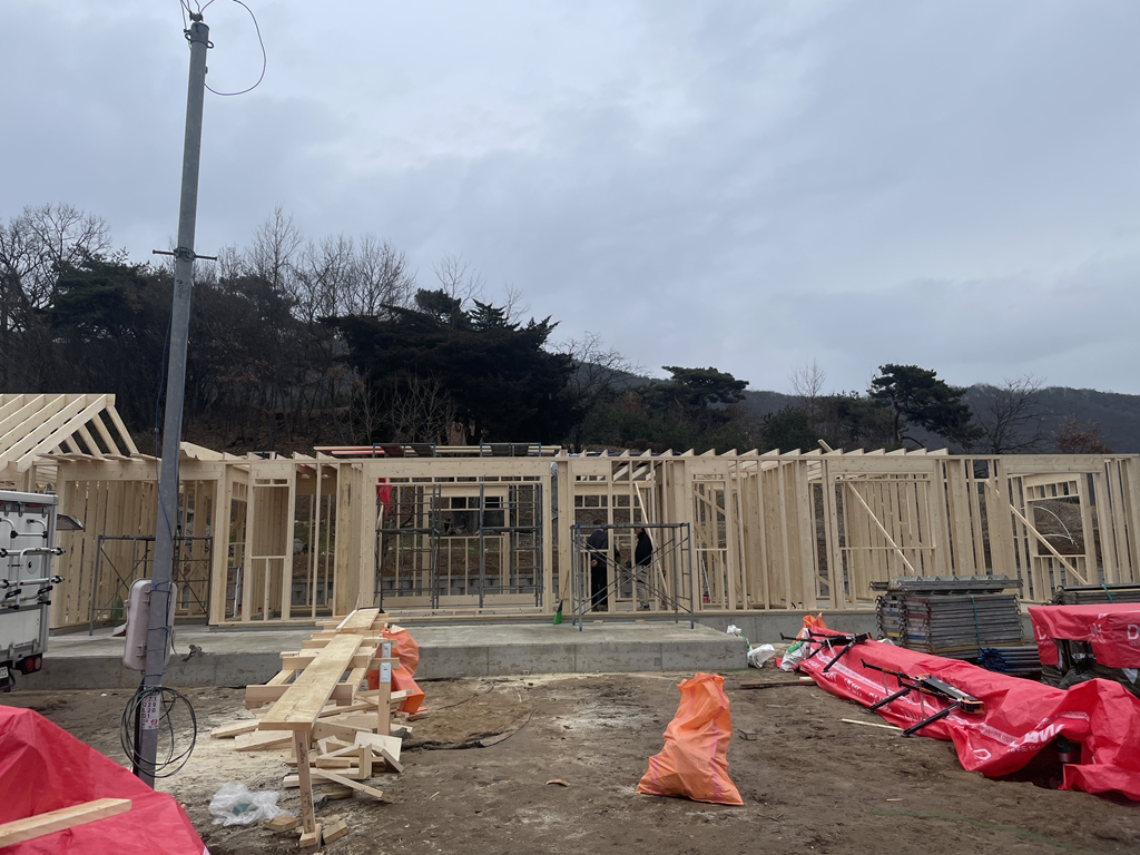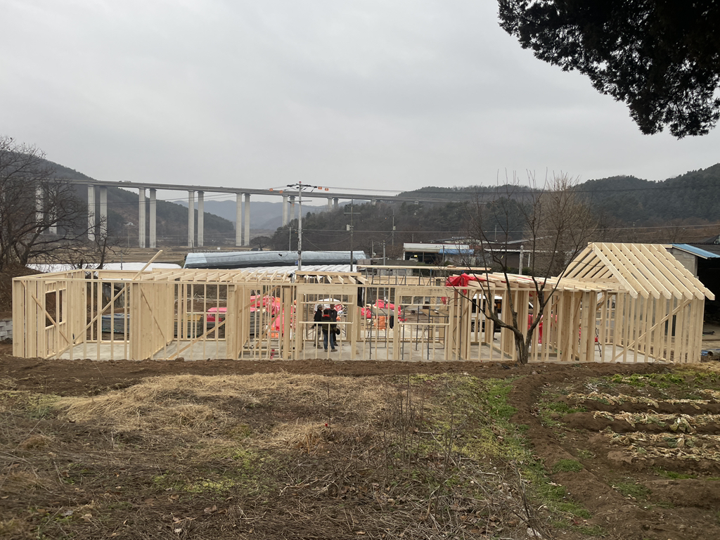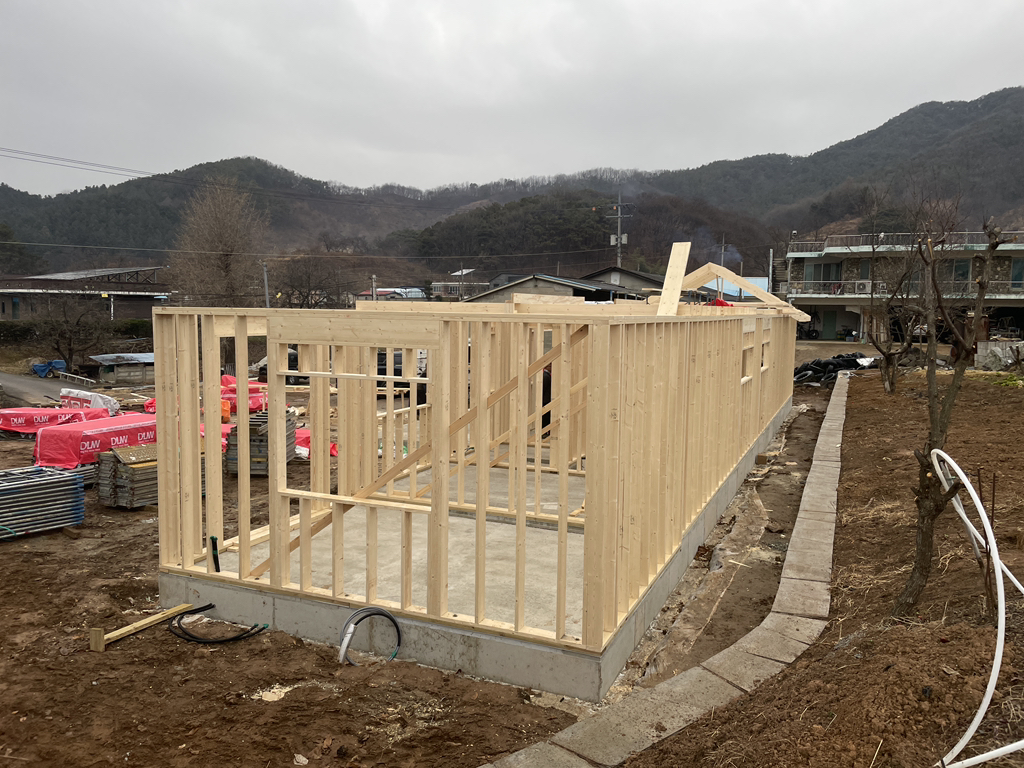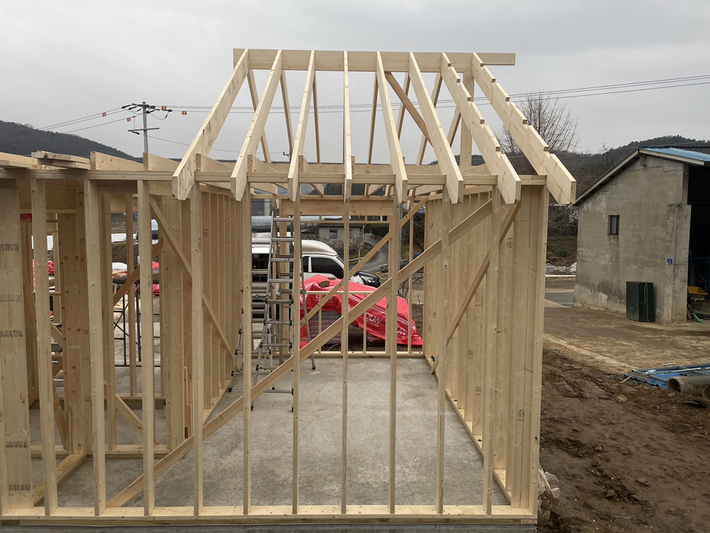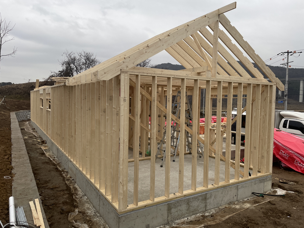 - 박공지붕 마룻대 및 서까래 일부 설치
