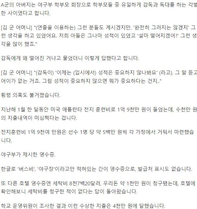 야구부 측이, 해외 전지 훈련비 수 천만 원을 횡령했다는 의혹도,