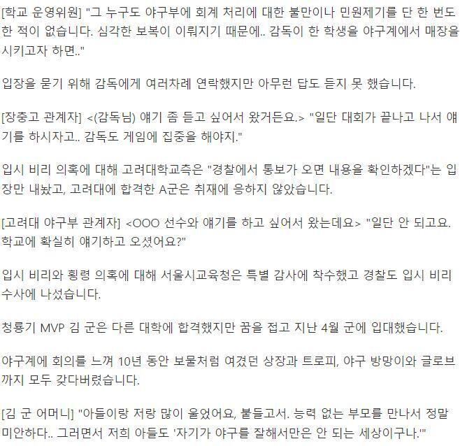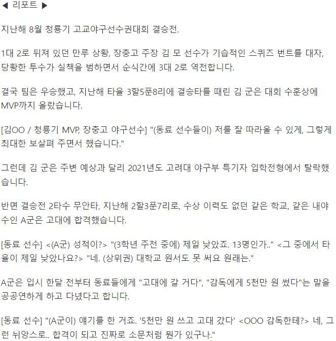 고려 대 입시에서 탈락하고, 성적이 훨씬 낮은 선수가 합격을 하면서,