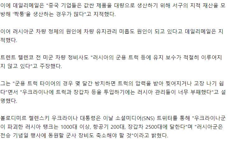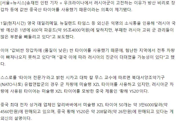 러시아군, 우크라이나 진격이 느린 이유 … "장갑차에, 중국산 짝퉁 타이어 사용"