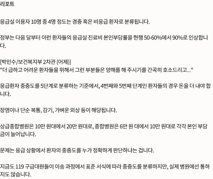 '비 응급' 자기 부담금, 90%로 인상 ‥ 환자한테, 경증 · 중증 판단하라고?