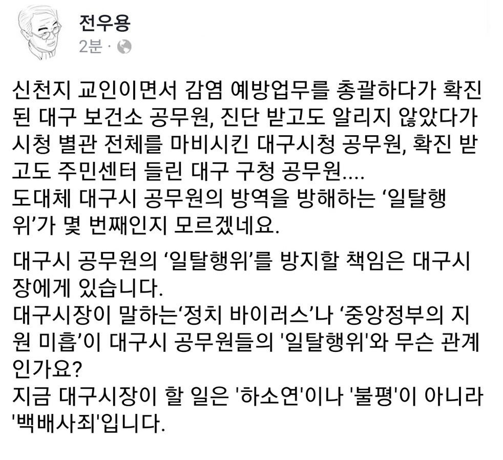 전우용 교수 페북 - 대구시 공무원의 방역 방해 행위 작성자내비도|작성시간20.02.27|조회수190 목록 댓글 2 글자크기 작게가 글자크기 크게가 다음검색 현재 게시글 추가 기능 열기 북마크 공유하기 신고 센터로 신고 댓글 댓글 2 댓글쓰기 답글쓰기 댓글 리스트 작성자두메산골 | 작성시간 20.02.27 올소 작성자CaFe | 작성시간 20.02.27 백배사죄 전에, 바이러스 방역 및 진압에 만전을 기하고, 사태 해결 노력부터 ! 댓글 전체보기