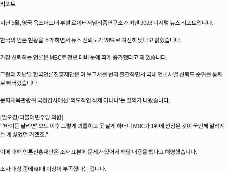 로이터 보고서 ‘MBC 신뢰도 1위’ 뺀, 언론 진흥 재단