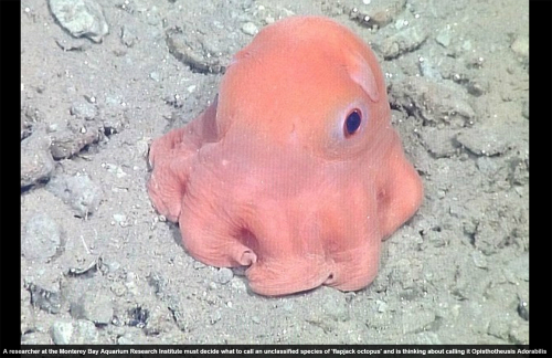 최근 수심 450m 깊이에서 잡힌 조그만 분홍색 문어이다