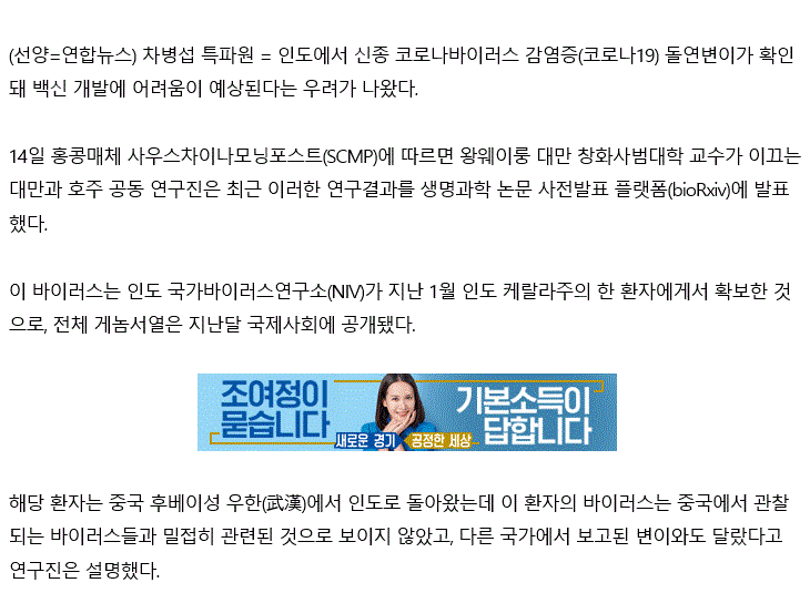"인도에서, 코로나 19 돌연변이 발견 … 백신 개발 차질 우려"