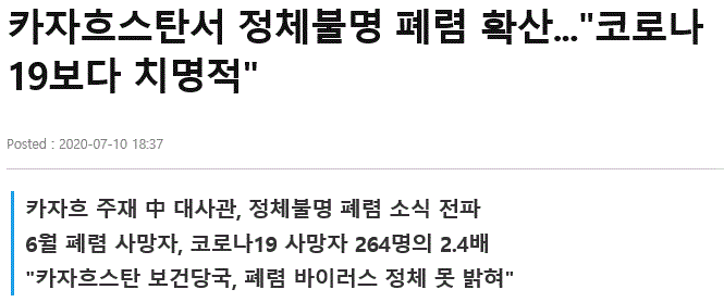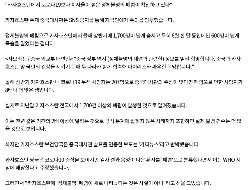 중국 "정체 불명 카자흐스탄 폐렴, '돌연변이' 가능성도"