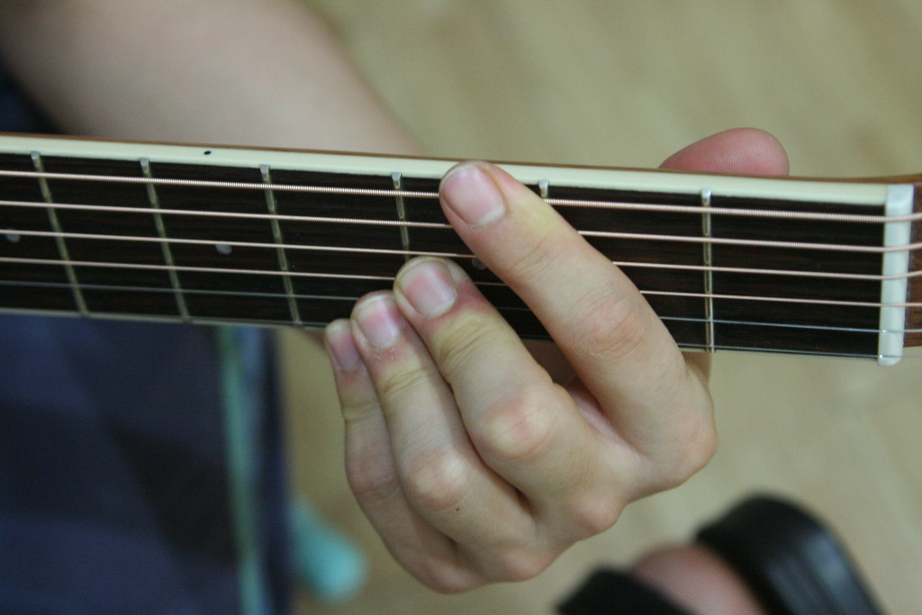 3. 나머지 필요한 플랫에 손가락들을 운지해보지만, 1~3번 줄에 닿아있어야 할 검지가 들려 맑은 소리가 나질 않습니다.