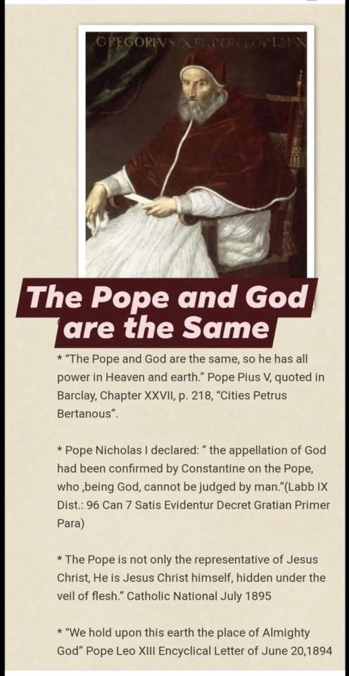 교황과 하느님은 똑같다. 그리하여 그는 하늘과 땅의 모든 권한을 갖고 있다. - 교황 피오 5세, 바클레이 챕터 27장