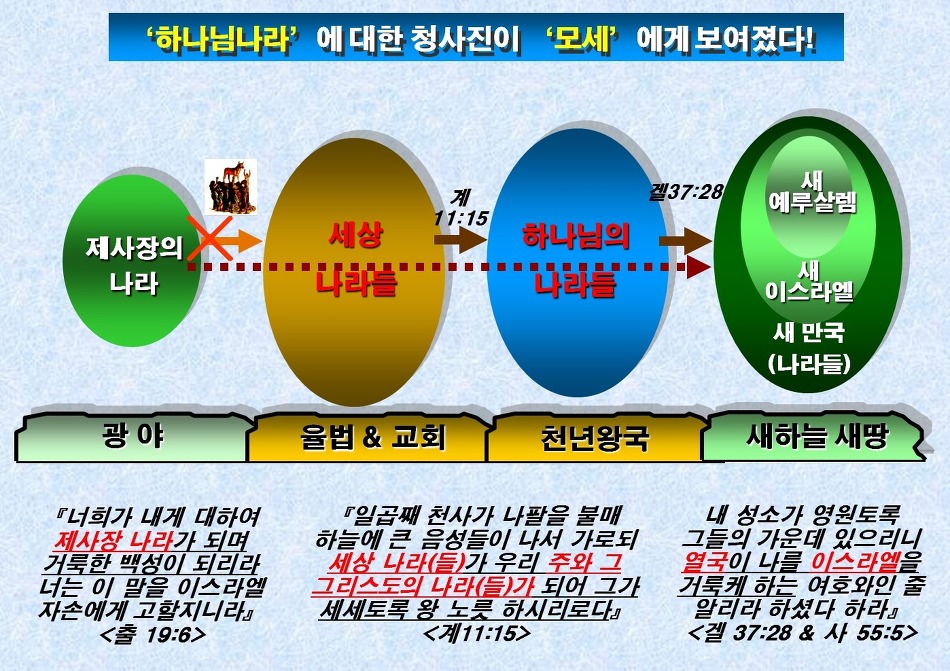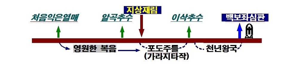 이 때 비로서 이 세상에는 하나님의 나라가 이루어지고 주님은 시온에 좌정하사 통치를 시작 하시게 된다(계11:15, 19:6, 사24:23, 슥14:9).