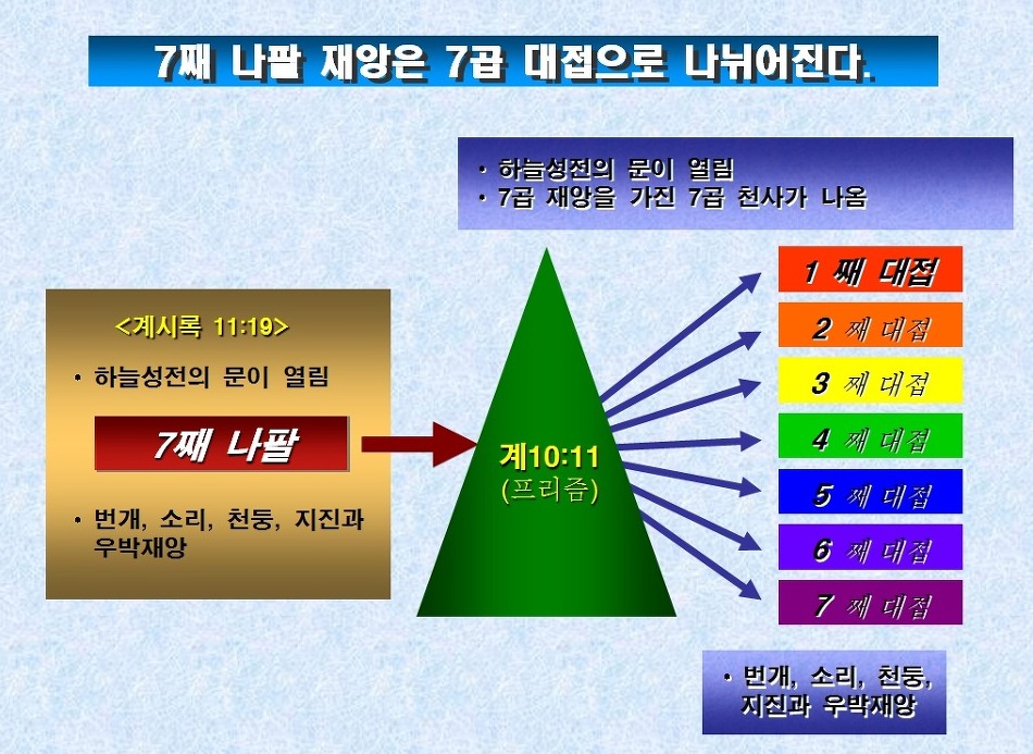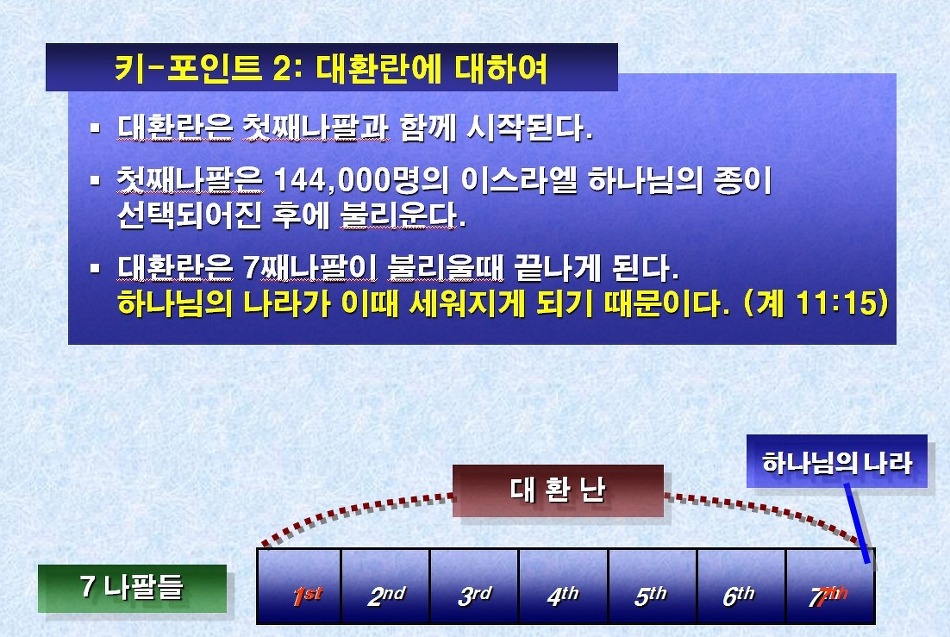 · 환난은 첫째나팔과 함께 시작이 되고 7째 나팔에서 끝난다. 왜냐하면 7째 나팔의 끝에서 하나님의 나라가 세워지기 때문이다. 다시 말하자면 나팔재앙의 기간이 환난의 기간이다.