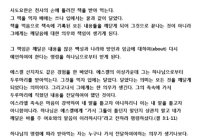 계10:8~11의 기록을 보면 요한은 천사로부터 책을 받아 먹고 그 책에 기록된 모든 내용을 이해하게 된다. 이로써 그는 장차 될 일에 대한 상세한 설명을 다시 해야하는 의무가 생긴 것이다. (이는 선지자 에스겔이 두루마리를 받아 먹고 이스라엘 족속에 가서 하나님의 멧세지를 전달 하였던 것과 흡사하다. --- 겔3:3~4)