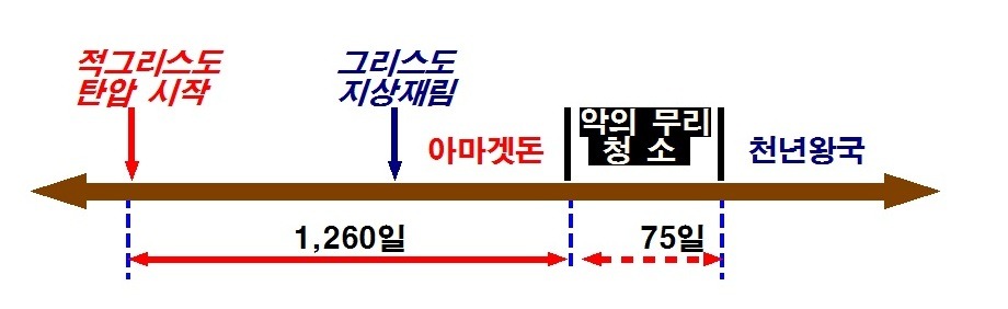 · 주님의 지상재림 후 천년왕국이 세워지기까지 거치는 과정을 알아 보자. 마지막 때에 관한 다니엘의 질문에 주님의 대답이 주어진다(단12:11~12). 즉 극심한 환난의 기간인 1260일에 30일을 더 지낼 것이며 또 45일을 더 기다리는 자는 복이 있다고 하였다. 아마 이 복은 천년왕국의 백성으로 살게되는 복인 것 같다.