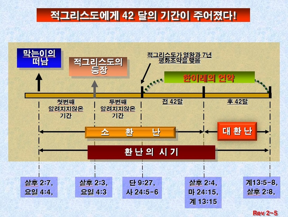 ·종말에 대하여 이야기할 때 가장 많이 언급되는 단어는 ‘7년 대환란’이지만, 환난의 기간이 단9:27의 '한 이례의 언약’이 환난의 기간과 일치한다고 말할 수는 없다. 만약 환란의 기간이 7년으로 정하여져 있다면 마지막 때의 되어질 일들에 대하여 가장 상세히 기록된 책인 요한계시록에 단 한번이라도 명시되었을 것이다. 왜냐하면 요한 계시록은 봉하지 않은채(계 22:10) 열린 책으로 주어졌기 때문이다.