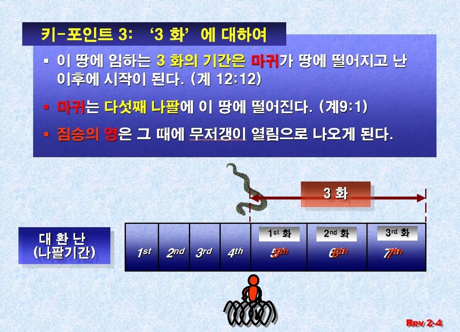 ·그러한 반면 요한계시록에서 3 화로 표현한 극심한 환난은 그 기간이 3년 반, 42달 또는 1,260일로서 계시록에 여러번 나타난다. 이 기간은 한 이레의 언약의 기간중 '후 삼년반’의 기간과 일치 한다