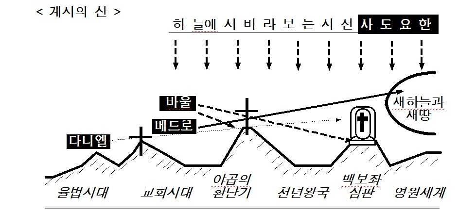 시선의 위치가 위로 올라 갈수록 시야는 넓어지고 더 멀리 볼 수 있다. 사도요한의 시선은 미래의 모든 산들을 볼 수 있는 하늘에서 내려보는 위치였다.