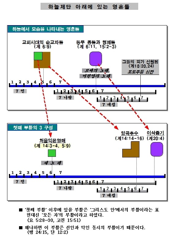 주님께서 라오디게아 교회의 이기는 자들에게"보좌에 앉혀 주겠다”는 약속을 하신 바 있다(계3:21). 아마 살아서 처음익은열매로 부활휴거되는 자는 보좌에 앉는 자의 부류에 포함될지도 모르겠다. 예수의 증거와 하나님의 말씀을 인하여 죽임을 당했던 영혼들은 5째 인이 떼어질 때 보여진 제단 아래의 영혼들(계6:9)과 동일한 자들이다. 또한 대환난의 기간에서 나오는 순교자들은 하나님의 계명을 지키기 위하여 짐승과 그의 우상에 경배하지 아니하고 이마나 손에 짐승의 표를 받지 아니한 동무종들 인것이다.