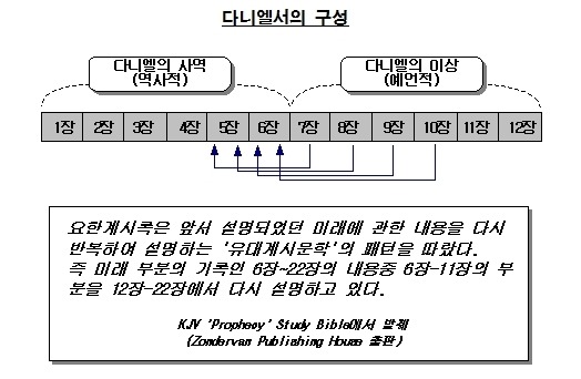 6장에서 22장까지는 장차 될 일에 대한 기록이다. 이 부분은 시간흐름 순으로 기록한 전반부(6장~11장)와 전반부의 중요한 사건들을 선별하여 이를 다시 설명하고 있는 후반부(12장~22장)로 나누어 진다. 이는 마치 창세기 1장이 6일간의 창조사역을 창세기 2장이 6일 째 되는 날의 사건을 다시 설명 하는 것과 같은 이치이다. 그럼 이와같이 두 부분으로 나누어야 하는 이유에 대하여 생각해 보자.