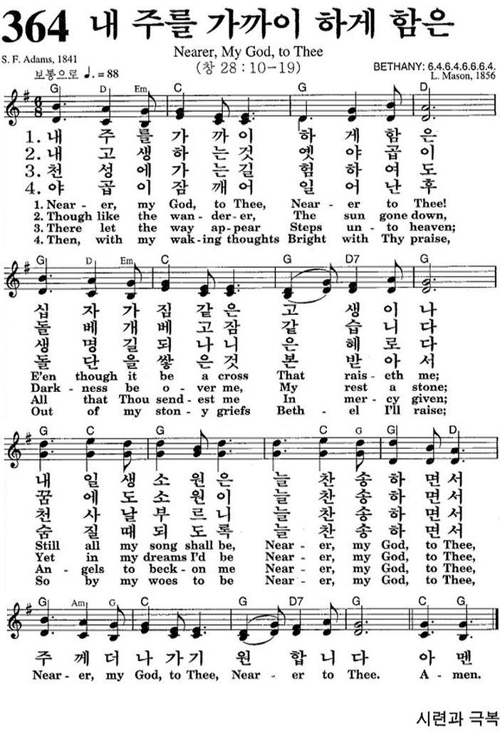 1. 내 주를 가까이 Nearer, my God, to Thee, 하게 함은 Nearer to Thee! 십자가 짐 같은 E'en though it be a cross 고생이나 That raiseth me 내 일생 소원은 Still all my song shall be, 늘 찬송하면서 Nearer, my God, to Thee, 주께 더 나가기 Nearer, my God, to Thee, 원합니다. Nearer to Thee. 2. 내 고생하는 것 옛 야곱이 Thnderer, The sun gone diwn, 돌베개 베고 Darkness be over me, 잠 같습니다 My rest a stone 꿈에도 소원이 Yet in my dreams I'd be 늘 찬송하면서 Nearer, my God, to Thee, 주께 더 나가기 Nearer, my God, to Thee, 원합니다. Nearer to Thee. 3. 천성에 가는 길 There let the way appear 험하여도 Steps unto heaven 생명 길 되나니 All that Thou sendest me 은혜로다 In mercy given 천사 날 부르니 Angels to beckon me 늘 찬송하면서 Nearer, my God, to Thee, 주께 더 나가기 Nearer, my God, to Thee, 원합니다. Nearer to Thee. 4. 야곱이 잠깨어 Then, with my waking thoughts 일어난 후 Bringt with Thy praise, 돌단을 쌓은 것 Out of my stony griefs 본받아서 Bethel I'll raise 숨질 때 되도록 So by my woes to be 늘 찬송하면서 Nearer, my God, to Thee, 주께 더 나가기 Nearer, my God, to Thee, 원합니다 아멘 Nearer to Thee. Amen.