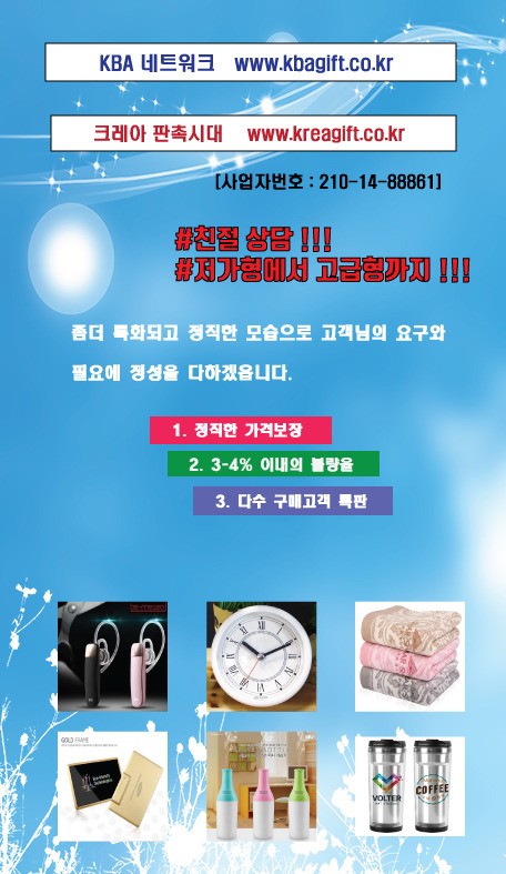 판촉물, 기념품 전문 [KBA 네트워크]와 [크레아 판촉시대]입니다.