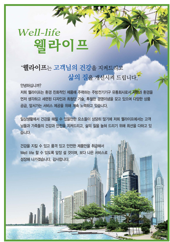 ◆ 회 사 명 : 웰 라 이 프 ◆ 대 표 자 : 정 우 철 ◆ 사 업 자 번 호 : 314-25-52813 ◆ 업 종 / 업 태 : 도소매 / 종합유통(가전제품) ◆ 사업장 소재지 : 대전시 유성구 어은동 116번지 1층 ◆ 전 화 번 호 : 042-935-9607 / 010-3439-1086 최근 주요실적 : 도안 13블럭 금성백조 예미지 공동구매업체 선정 13블럭 예미지 101동 101호에 가시면 전시되어 있습니다. 신안인스빌의 구경하는집에도 전시할 예정입니다. 전기렌지 정보 및 구매후기 보러가기 >> 클릭!