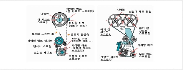 | 피스톤의 위치와 밸브의 위치가 실린더별 각 행정에 맞게 일치 되어야만 큰 힘을 얻어낸다. 그러기 위해서는 크랭크축 스프로켓의 타이밍 마크와 크랭크케이스에 있는 타이밍 마크가 일치되고, 캠축의 스프로켓에 표시된 타이밍 마크와 헤드에 표시된 타이밍 마크가 동시에 일치되어야 한다. 그러기 위해서는 크랭크축이 2회전 시 캠축은 1회전의 비율로 일치된다. | |