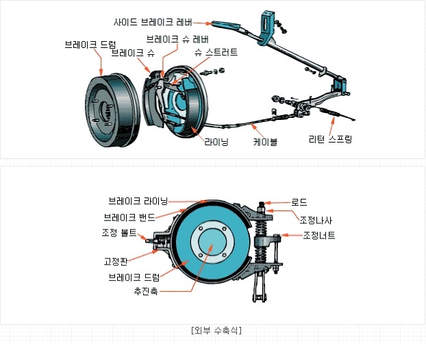 브레이크 본체의 구조는 풋 브레이크의 기구를 이용하여 브레이크 슈를 아래의 그림에서와 같이 케이블이 당겨지면 브레이크 슈 레버가 당겨지면서 슈 스트럿에 의해 힘이 전달되고 좌우 라이닝이 벌려지면서 슈를 드럼에 밀어 제동이 된다. 이 방식은 드럼식 브레이크장치에 장착되는데 풋 브레이크 라이닝에 브레이크 슈 레버를 장착하여 주차 브레이크와 같이 사용하는 방식이 많이 사용된다. | |