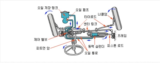 | 대형자동차나 저압 타이어를 사용한 차에서는 앞바퀴의 접지 저항이 크기 때문에 핸들의 조작력이 크게 되고 신속한 조향조작이 안될 염려가 발생한다. 그러므로 가볍고 신속한 조향 조작을 하기 위해 동력 조향장치를 사용하며 기관으로 오일 펌프를 구동하여 발생한 유압을 조향장치 중간에 설치된 배력 장치로 보내서 배력 장치의 작동으로 핸들의 조작력을 가볍게 하는 구조로 되어 있다. | |